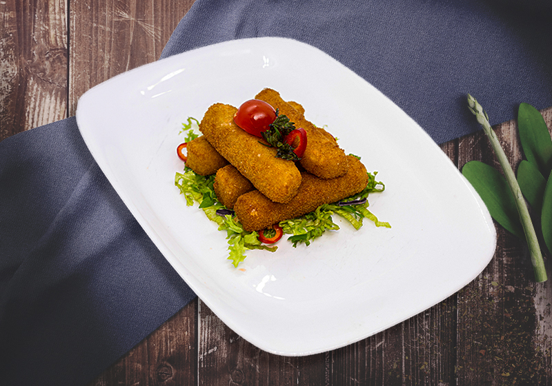 Cascaval 150g, Ou 50g, Pesmet 35g, Ulei 30ml, Faina 30g, Salata verde 30g, Rosii 20g