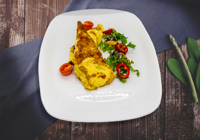 Ou 150g, Cascaval 70g, Salata verde 30g, Ulei 20ml, Rosii 12g, Ardei gras 8g